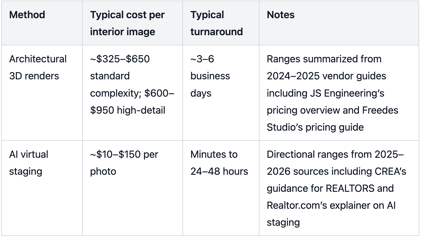 Each approach has a place. Architectural renders help with approvals and design development. Physical staging suits a limited number of model units. Multi-family virtual staging shines for fast, high-volume marketing imagery during lease-up.